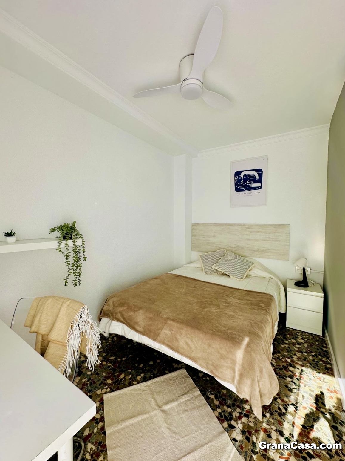 -Dormitorio 4 (interior, con baño 2 y patio): Cama de 135 cm, armario empotrado y escritorio.